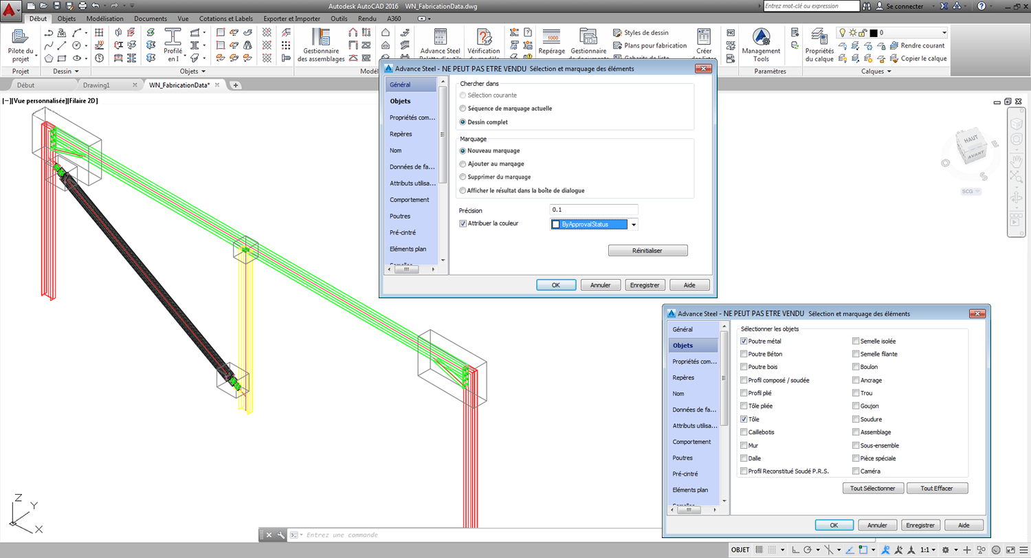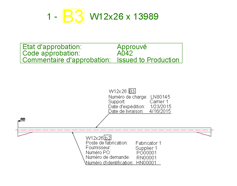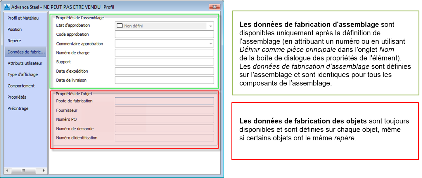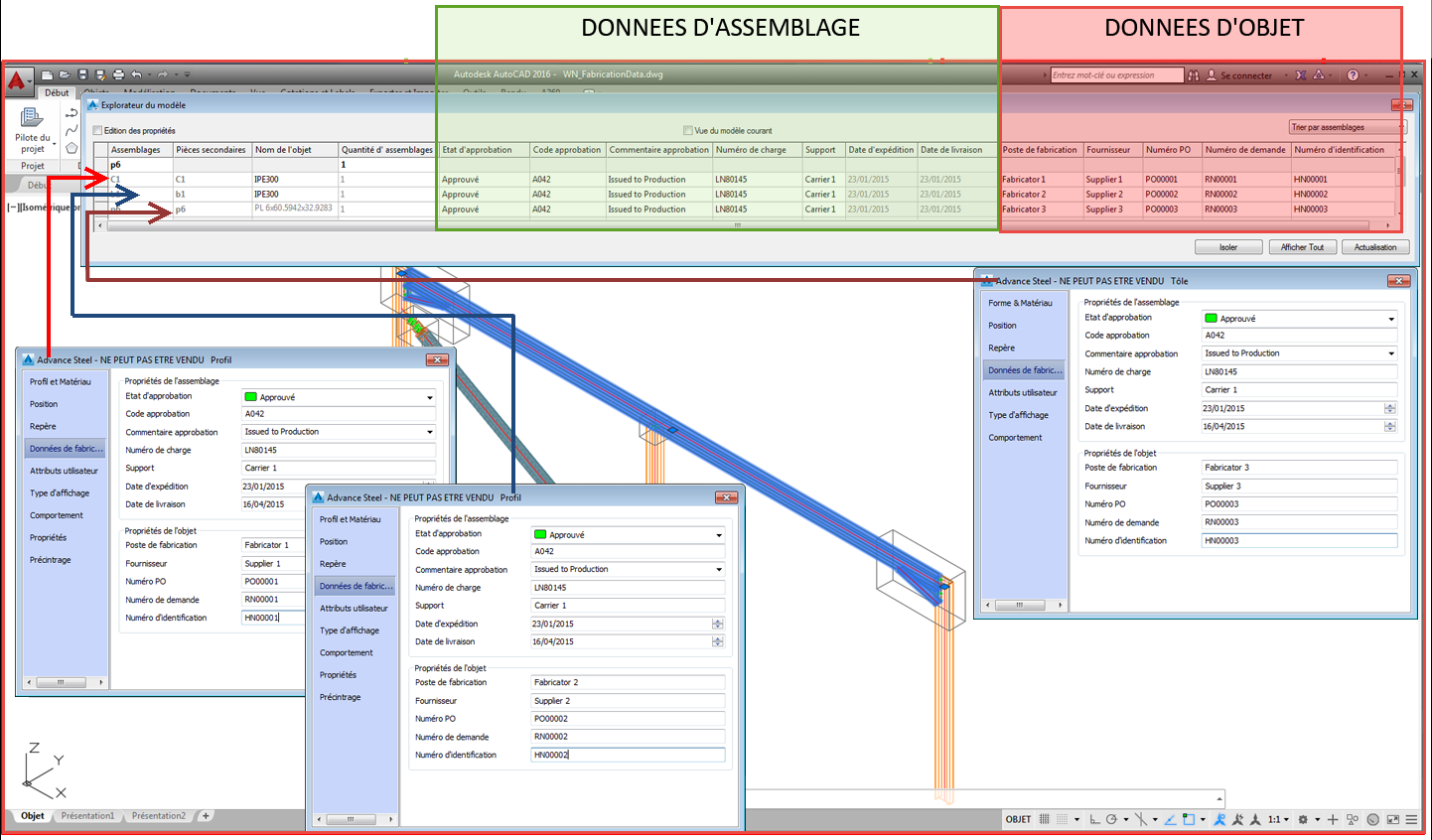 Les objets de modèle (poutres, tôles, caillebotis, etc.) et les assemblages (groupes d'éléments assemblés selon des critères spécifiques) sont décrits par différentes informations de fabrication dans le modèle, en fonction de l'état du projet :