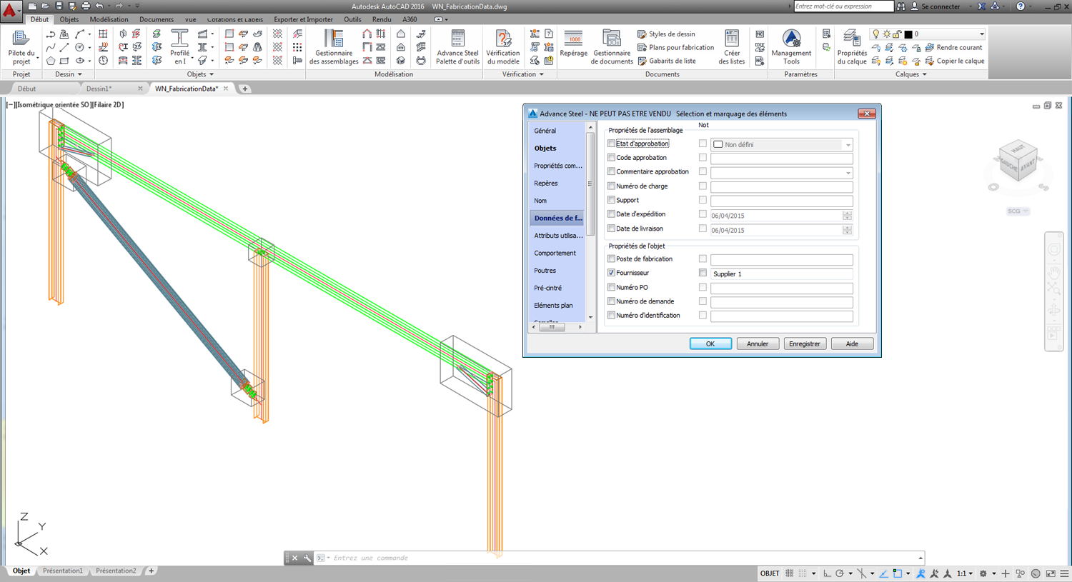 Etat d'approbation, Code approbation et Commentaire approbation indiquent l'état de modélisation d'un assemblage.