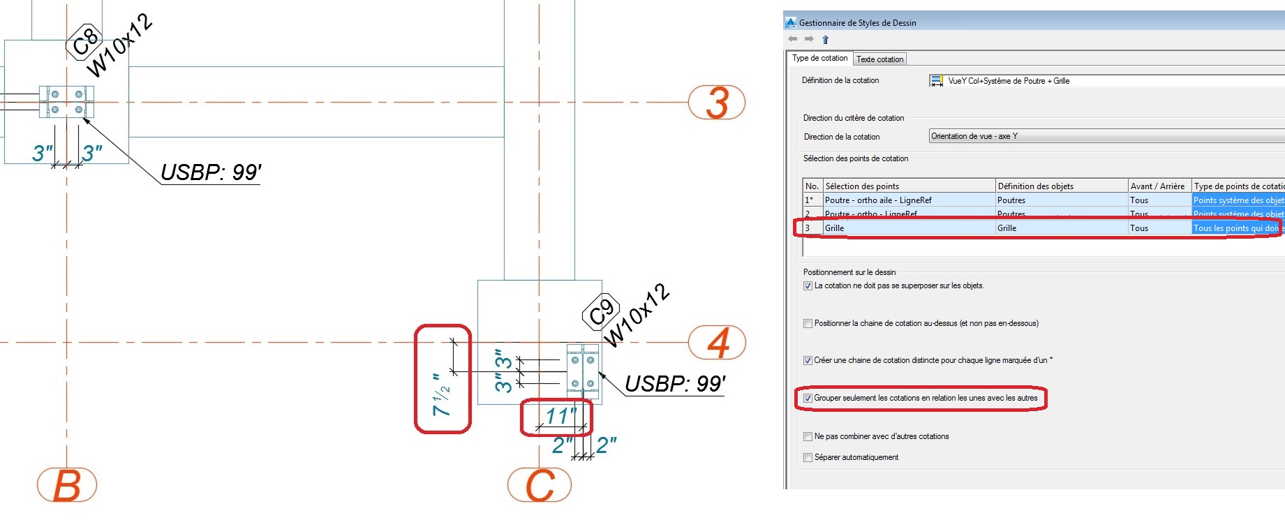 Les cotations avec une référence de grille sont toujours référencées uniquement sur la ligne de grille la plus proche et non sur toutes les lignes de grille.