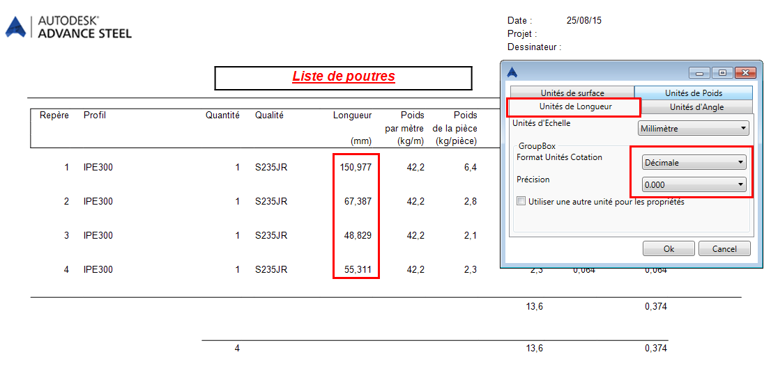 Application correcte des résultats de précision pour les listes de listes externes, selon les paramètres d'unités de gabarit