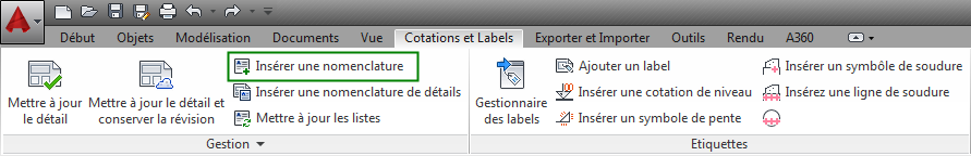 La commande Insérer une liste a été modifiée de sorte que vous pouvez désormais créer des listes dans les plans d'ensemble. Le nom de la commande dans le ruban a été modifié en Insérer une nomenclature et se trouve au même emplacement qu'auparavant :