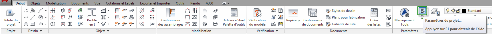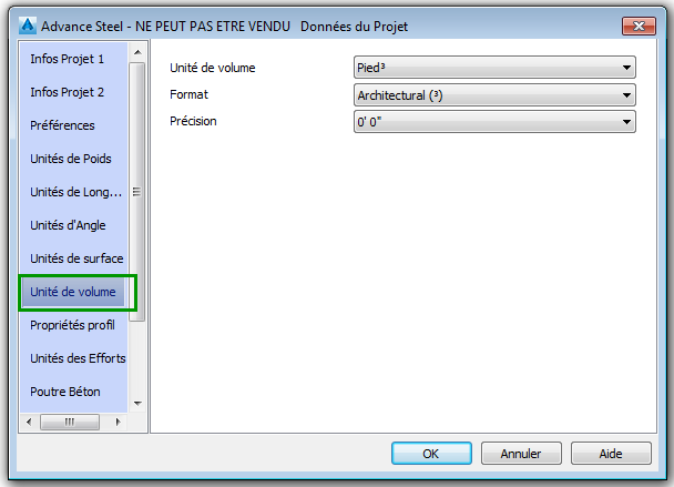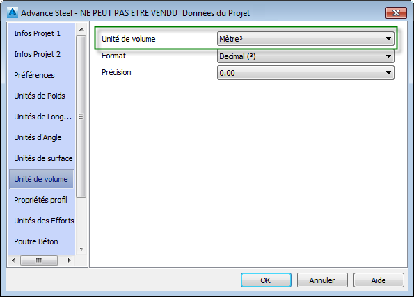 Vous pouvez configurer les unités de volume de la même façon que vous configurez les autres unités : onglet Début > panneau Paramètres > bouton Paramètres du projet. Dans la fenêtre Données du Projet, accédez à Unité de volume.