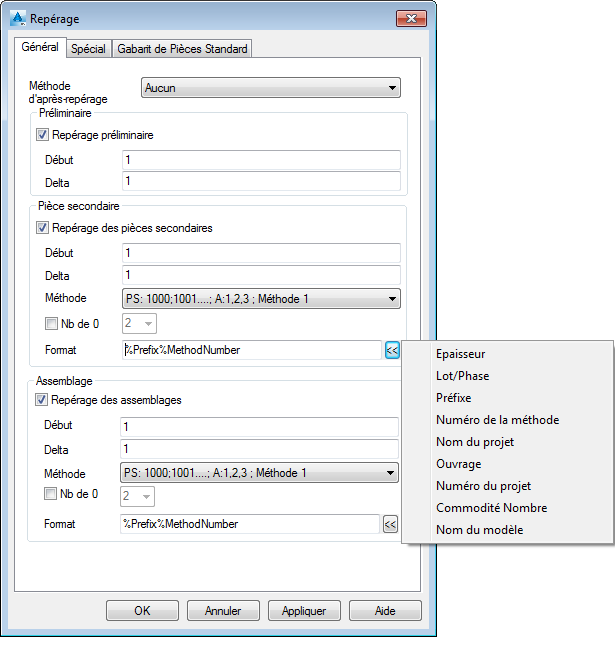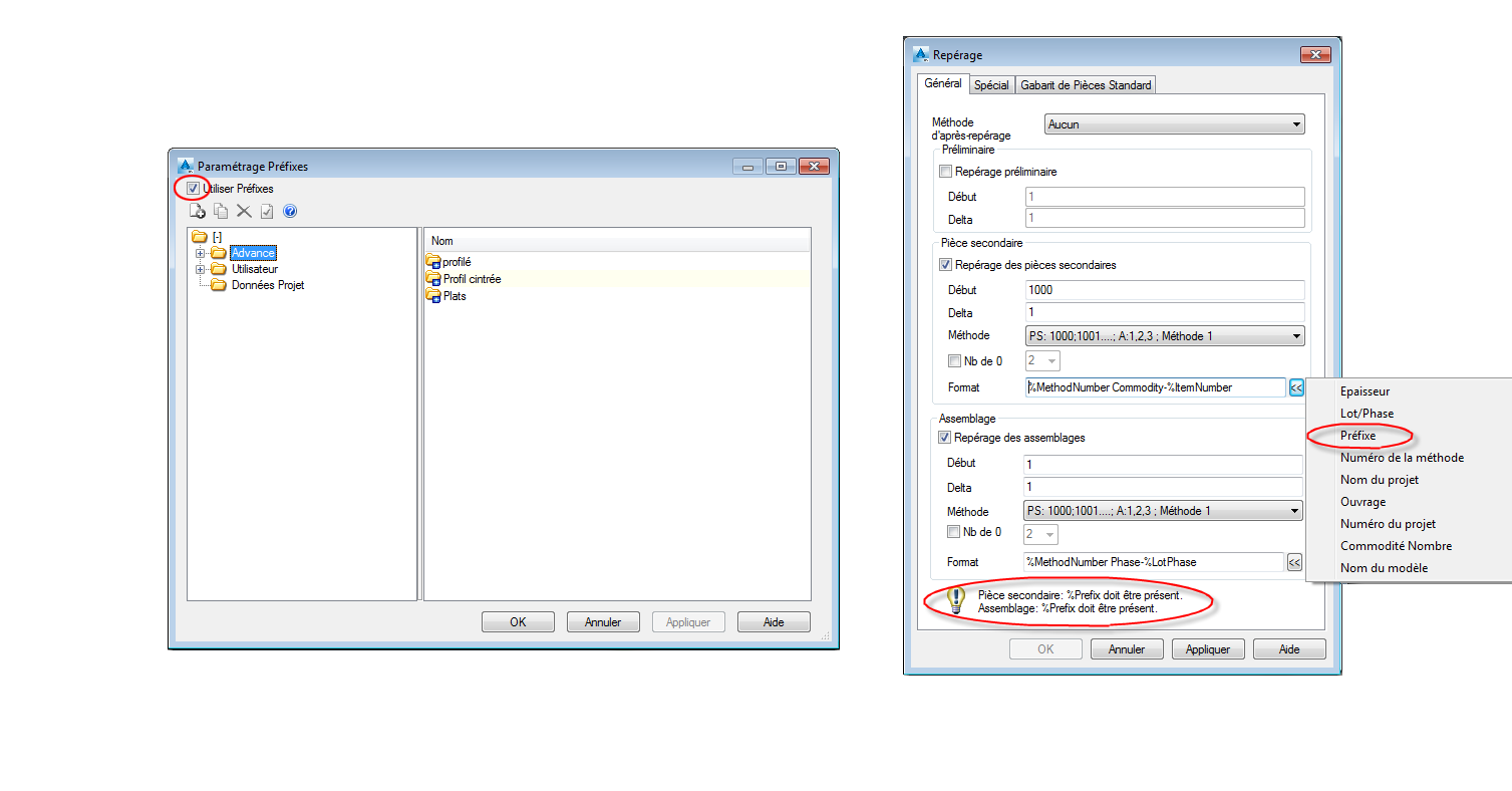 - La variable Préfixe est obligatoire lorsque vous activez Utiliser Préfixes dans la boîte de dialogue Préfixe (Ruban : Sortie > Repères :