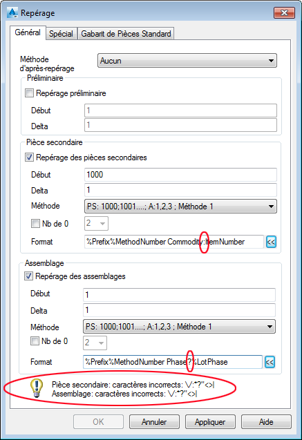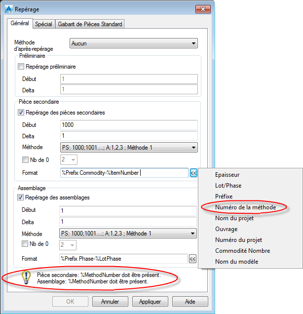- La variable Numéro de la méthode (%MethodNumber) est obligatoire. Un message d'avertissement s'affiche dans la partie inférieure de la boîte de dialogue lorsqu'elle est manquante.
