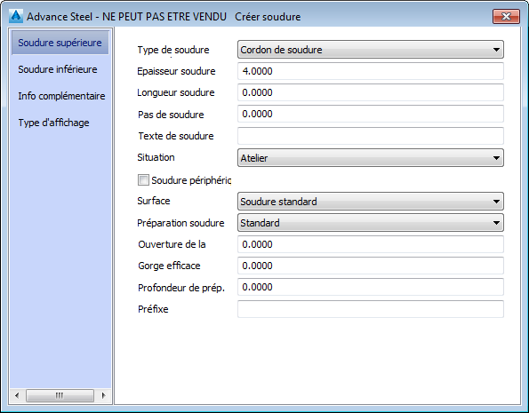 Onglet Soudure supérieure :