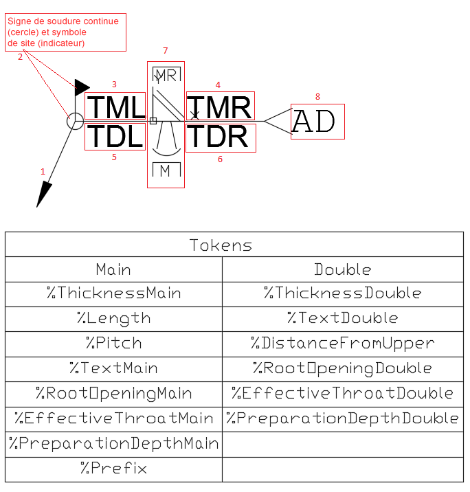- Symboles (soudure tout autour, symbole de site, type de soudure, forme de soudure, préparation de soudure) : couleur, conception, position (2, 7)