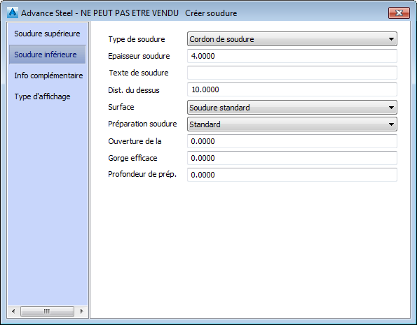 Onglet Soudure inférieure :