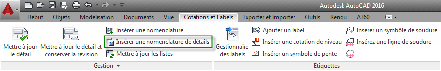 Grâce à la nouvelle fonction Insérer une nomenclature de détails, vous pouvez créer une liste qui contient des informations sur des détails spécifiques dans un plan, en fonction de votre sélection. La commande est disponible sur le ruban, dans l' onglet Cotations et Labels > le panneau Gestion, sous la commande Insérer un dessin :