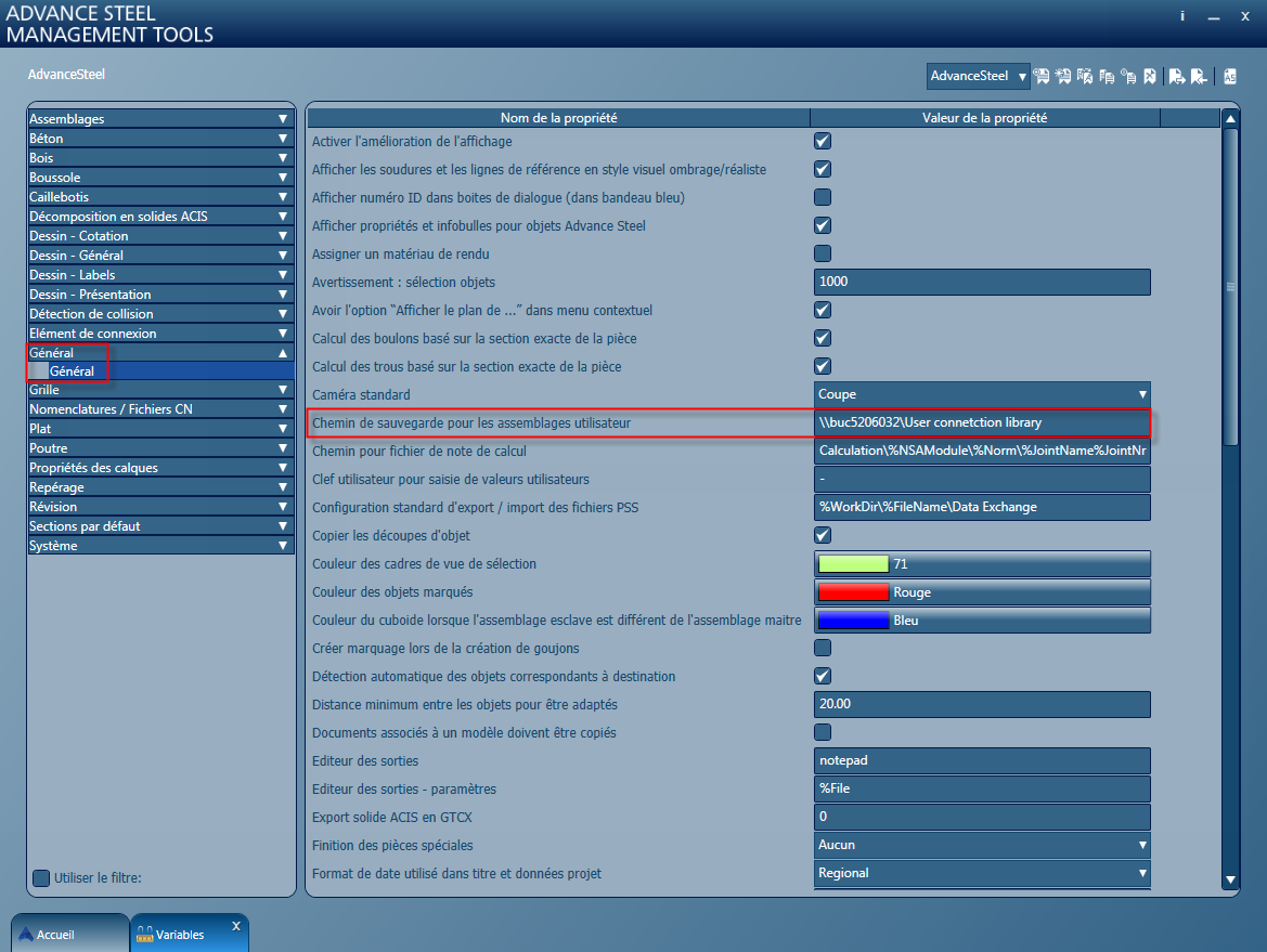La nouvelle valeur par défaut de Chemin de sauvegarde pour les assemblages utilisateur est disponible dans Management Tools. En indiquant cette valeur par défaut avec n'importe quel chemin d'accès réseau d'un dossier, vous pourrez accéder à cet emplacement et utiliser les fichiers gabarits Assemblage utilisateur stockés à cet emplacement dans Advance Steel.