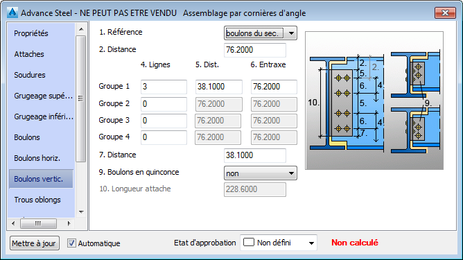 Vous avez désormais la possibilité d'ajouter un 3e et 4e groupe de boulons, dans l'onglet Boulons vertic. de la fenêtre Propriétés de l'assemblage. Vous pouvez personnaliser le nombre de lignes de boulons et les distances de début/intermédiaire, indépendamment des autres groupes de boulons.