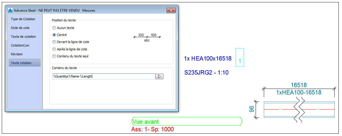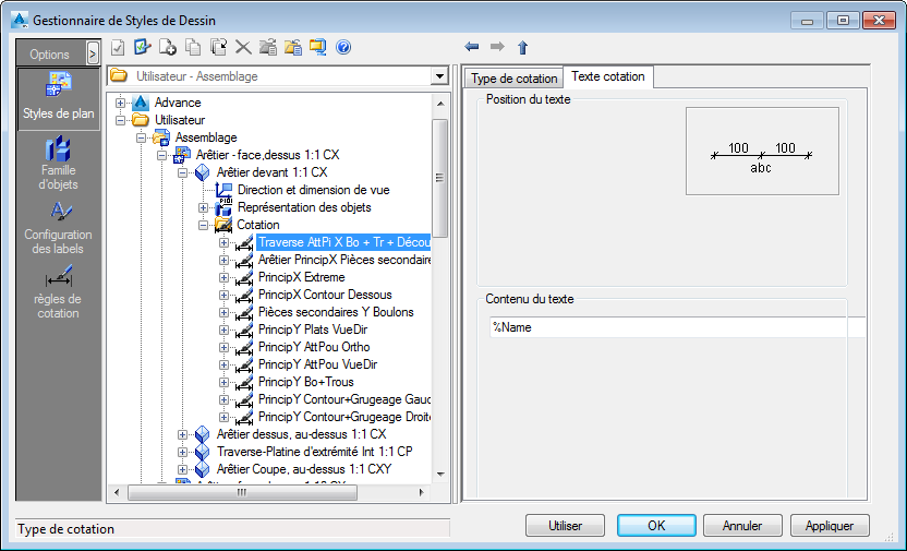 Vous pouvez configurer les éléments à afficher dans le label de cotation à l'aide de cette commande :