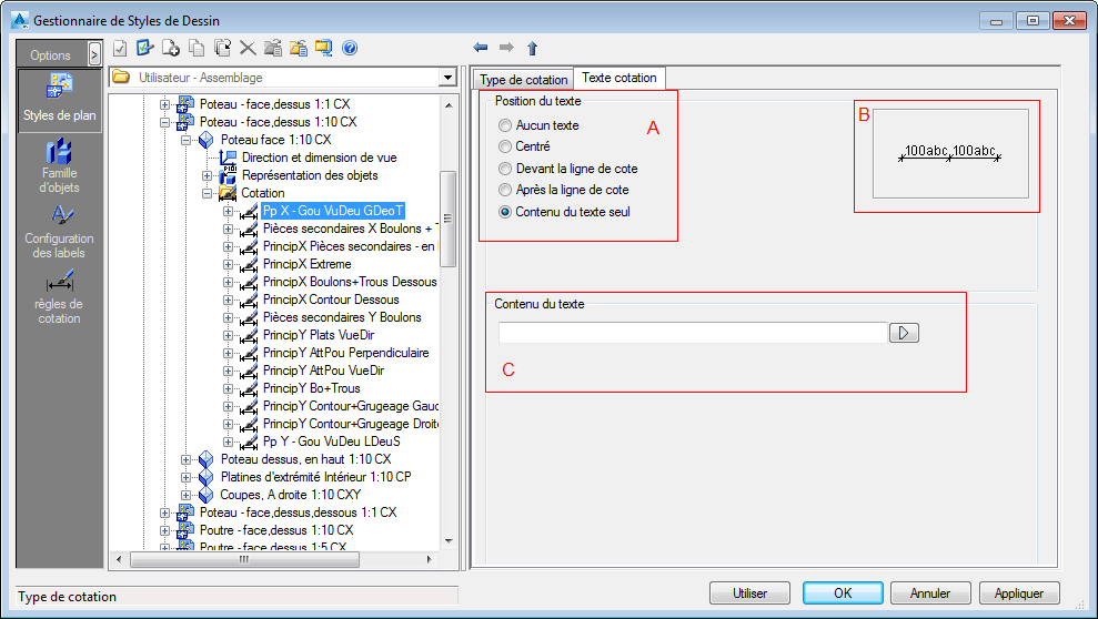 Lorsqu'un label de cotation est ajouté au Gestionnaire des styles de dessin, il est automatiquement appliqué dans le dessin de détail lorsque le style est utilisé.