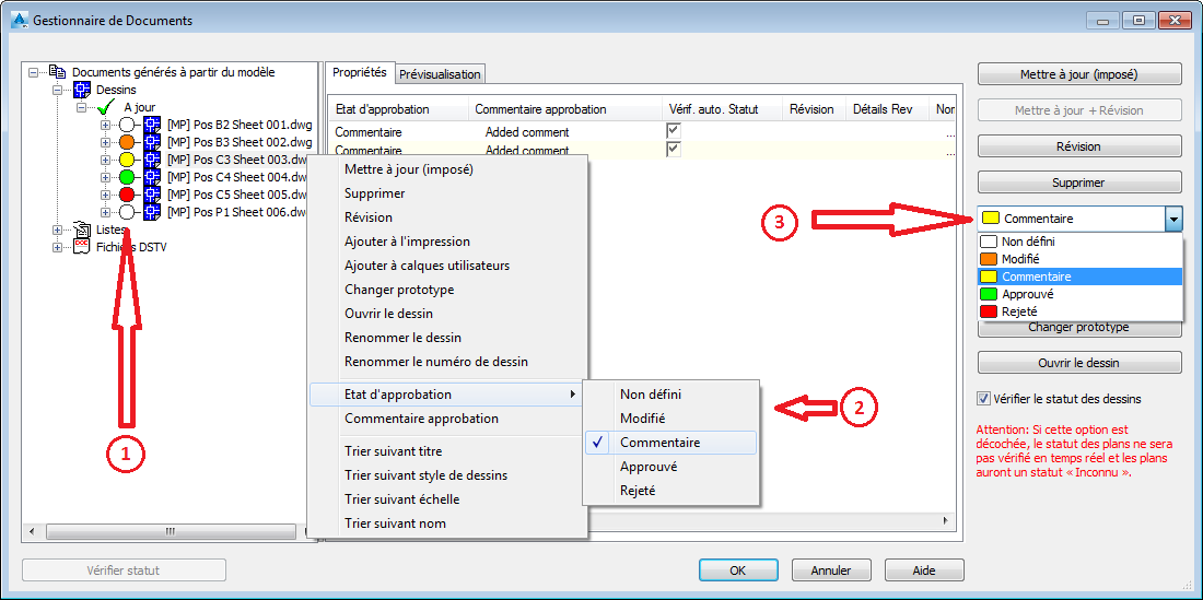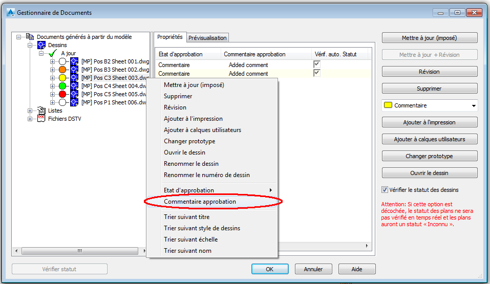 Pour ajouter un commentaire sur le dessin, choisissez Commentaire approbation dans le menu contextuel.