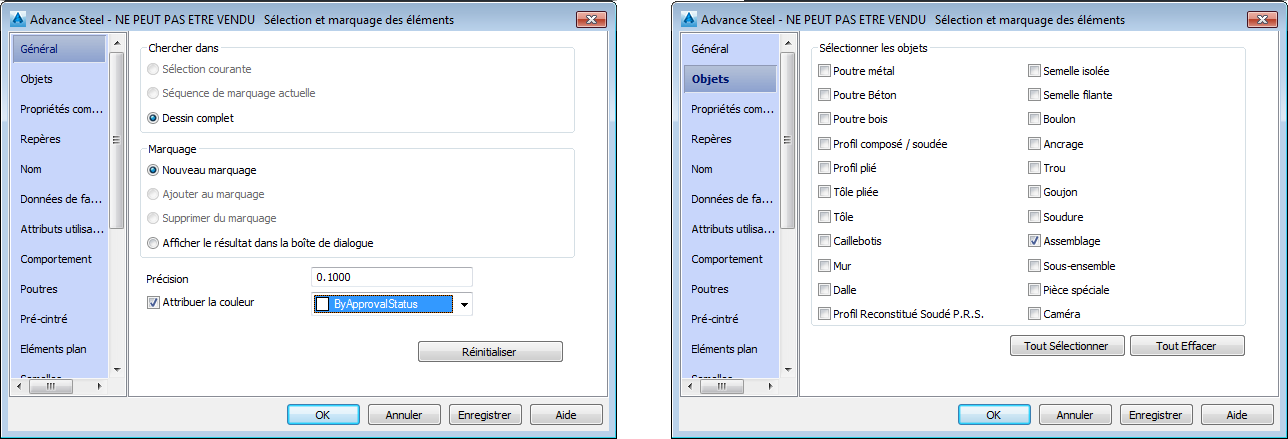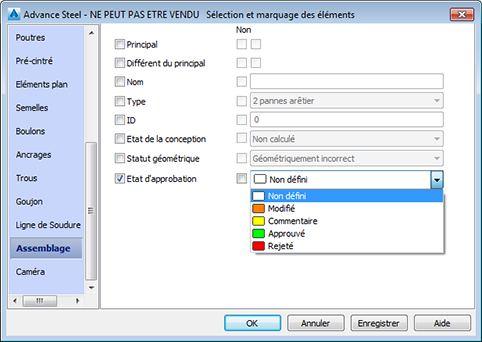 Les objets de recherche et de repère possèdent des options qui vous permettent de marquer les assemblages en fonction de l'Etat d'approbation ou d'effectuer une recherche par Etat d'approbation.