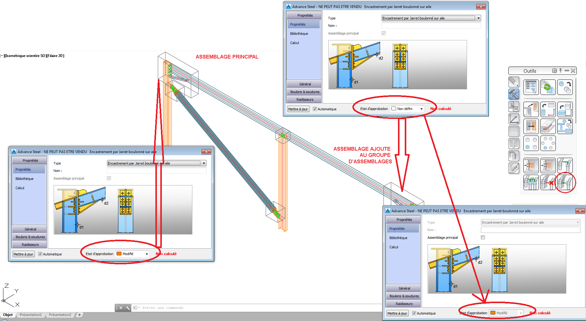Lorsque vous créez un nouvel assemblage à l'aide de la commande Inclure un assemblage dans un groupe , l'Etat d'approbation de l'assemblage principal est transféré : l'Etat d'approbation du nouvel assemblage est le même que l'Etat d'approbation de l'assemblage principal. Lorsque vous utilisez la commande Exclure un assemblage d'un groupe , l'Etat d'approbation ne change pas.