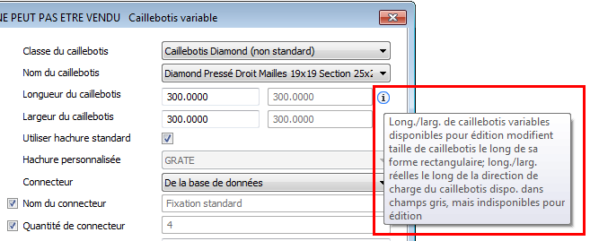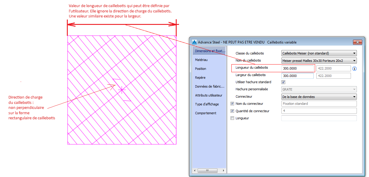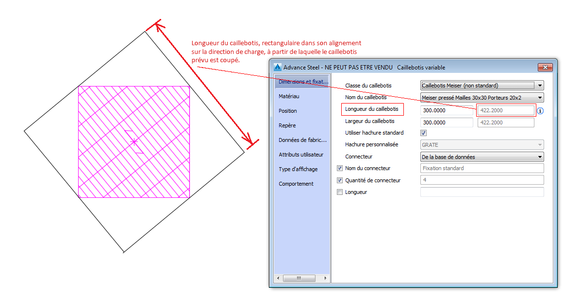 Correction du comportement incohérent qui se produisait lors de la saisie et de l'affichage des valeurs de longueur et de largeur de caillebotis pour les caillebotis variables rectangulaires, avec une direction de charge (direction des hachures) non perpendiculaire avec la direction du caillebotis.