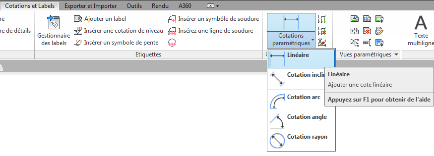 Vous disposez à présent d'une commande unique pour les lignes de cotation horizontales et verticales au lieu de deux commandes. Selon la façon dont vous traitez la cotation dans l'étape d'aperçu (avant de la placer dans le détail), elle sera créée sous forme de cotation horizontale ou verticale. L'emplacement de la commande sur le ruban n'a pas été modifiée : Cotations et Labels , panneau Cotations paramétriques :