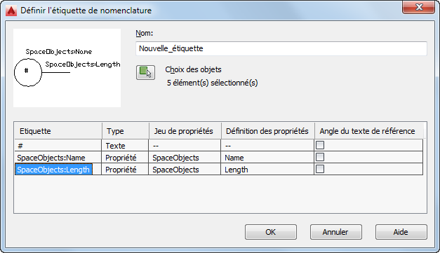 Cette procédure permet de créer une étiquette de nomenclature capturant et affichant les données de jeux de propriétés pour un objet spécifique du dessin.