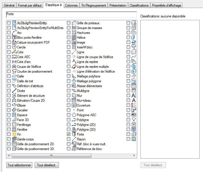 Le volet de droite répertorie toutes les définitions de classifications qui s'appliquent à un type d'objet sélectionné quelconque. Vous pouvez sélectionner plusieurs classifications dans plusieurs définitions de classifications. Si des classifications sont sélectionnées, les tables de nomenclature de ce style peuvent inclure des objets sélectionnés à gauche uniquement s'ils ont été classifiés avec les classifications sélectionnées.