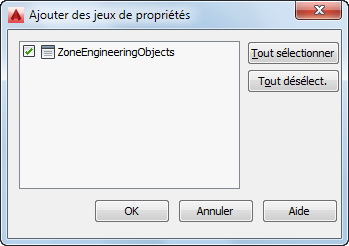 - Dans la boîte de dialogue Ajouter des jeux de propriétés, sélectionnez ObjetsZoneIngénierie et cliquez sur OK.