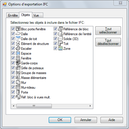 - Cliquez sur l'onglet Objets et sélectionnez les objets à inclure dans le fichier IFC.