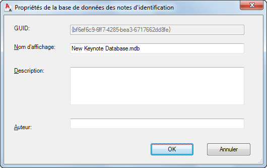 Une base de données Microsoft Access vierge est créée avec toutes les tables et requêtes nécessaires pour le stockage et l'extraction des notes d'identification. La nouvelle base de données dispose d'un identificateur global unique (GUID) qui s'affiche dans le champ GUID et apparaît dans l'Editeur des notes d'identification comme noeud racine avec le nom d'affichage que vous avez fourni.