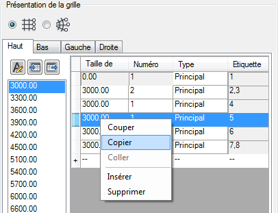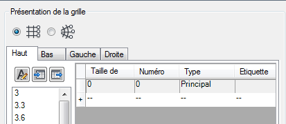 Avertissement : Pour une grille standard qui possède la même disposition de ligne de grille des deux côtés (Haut/Bas, Gauche/Droite), il n'est pas nécessaire d'effectuer des réglages dans les onglets Droite et Bas. Par défaut, les paramètres de côté Haut et Gauche sont reportés sur les côtés Bas et Droite, s'ils ne sont pas définis séparément.