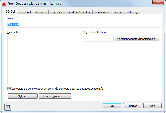 Si, par exemple, vous souhaitez que les murs d'un style particulier (murs d'un cabinet de toilette ou du comptoir d'une cuisine) ne soient pas utilisés comme objets de contour, il suffit de définir la propriété Espaces liés du style de mur sur Non, pour que tous les murs de ce style soient ignorés lorsque vous générez un espace.