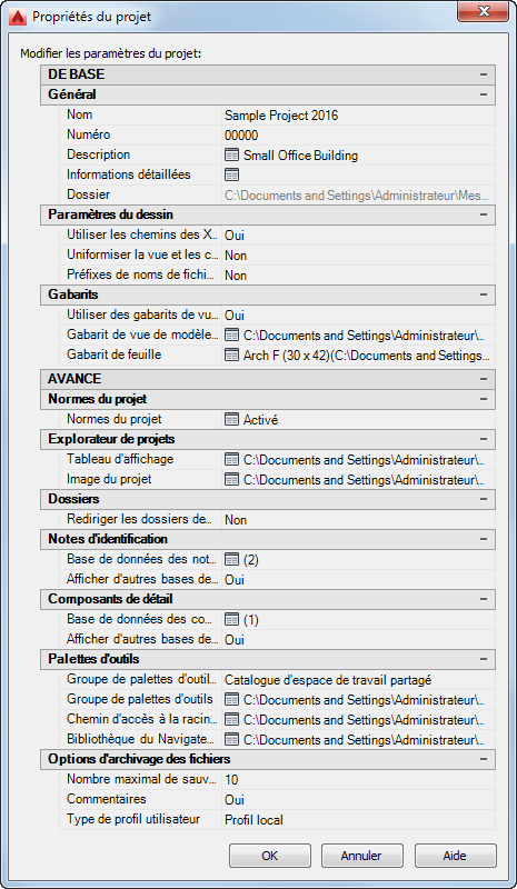 Si vous choisissez Catalogue d'espace de travail partagé, le chemin sélectionné pour la propriété Emplacement du fichier de la palette d'outils est ajouté au profil de projet de l'utilisateur (AWS) et le catalogue d'outils est utilisé à partir de l'emplacement indiqué. Si vous choisissez Catalogue d'espace de travail spécifique à l'utilisateur, le programme crée un dossier sous \\Documents and Settings\<Nom_utilisateur>\ et copie les palettes d'outils dans ce dossier.