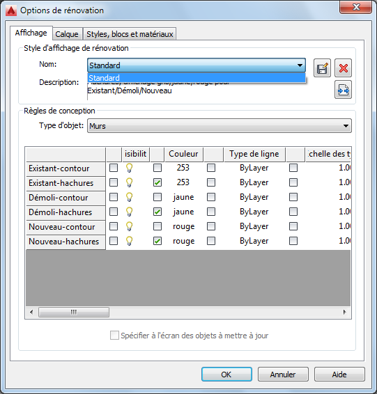 Vous pouvez changer la manière dont les propriétés d'un objet dans des catégories spécifiques s'affichent dans le dessin. Pour cela, déverrouillez-les, changez-les individuellement puis enregistrez-les en tant que style d'affichage de rénovation. Les modifications effectuées sont enregistrées dans le dessin en cours.