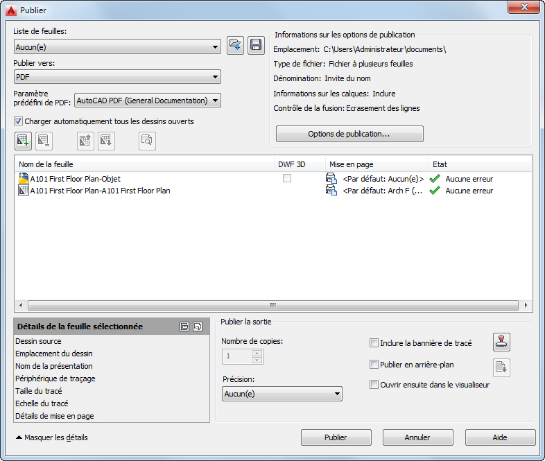 Il est possible de décider que les dessins sont automatiquement publiés au format PDF (ou DWF ou DWFx) quand ils sont enregistrés ou fermés. Les paramètres de publication automatique vous permettent de choisir si vous voulez inclure les modèles, les positionnements ou les deux et si vous voulez publier un fichier à feuille unique ou feuilles multiples.