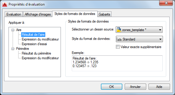 Le résultat de l'aire ou du périmètre s'affiche à la précision définie par le style de format de données et indique, dans une autre colonne, sa valeur exacte sans arrondi.