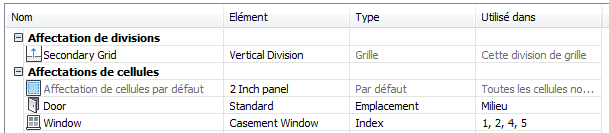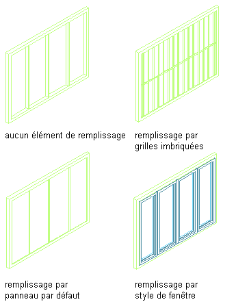 Un élément de remplissage définit le contenu d'une cellule de bloc porte/fenêtre. Une cellule de bloc porte/fenêtre peut comporter le panneau simple par défaut ou contenir une grille imbriquée, un polygone AEC, une unité de mur-rideau, un style de porte ou un style de fenêtre. Les styles d'objets que vous utilisez dans les éléments de remplissage doivent exister dans le dessin en cours pour que vous puissiez les ajouter à une définition d'élément de remplissage. Les panneaux représentent en général des vitrages ou tout autre élément d'habillage tel que la pierre ou le béton.