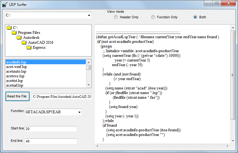 Affiche le contenu d'un fichier AutoLISP par fonctions individuelles.