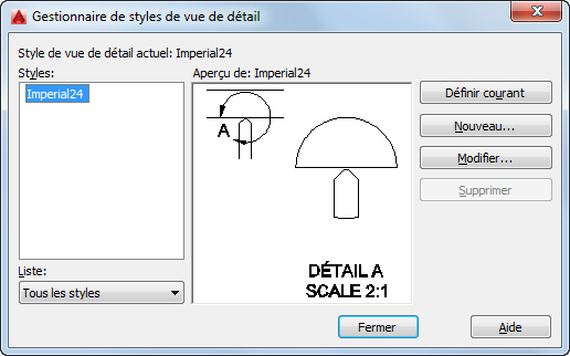 Affiche la liste des styles de vue de détail disponibles dans le fichier de dessin courant. Le style courant est mis en surbrillance.