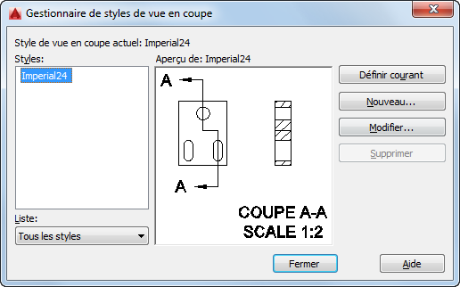 Affiche une liste des styles de vue en coupe disponibles dans le fichier de dessin courant. Le style courant est en surbrillance.