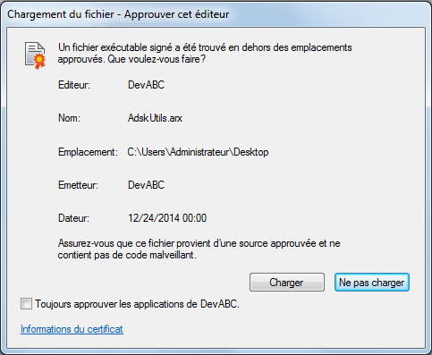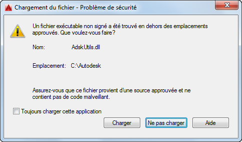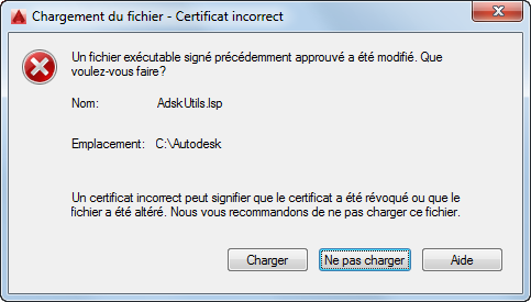 Lorsque vous chargez un fichier programme signé numériquement, le programme AutoCAD en vérifie la signature numérique. Selon que la signature numérique a pu être vérifiée ou non, un message autorisant ou refusant le chargement du fichier dans l'environnement de dessin apparaît.