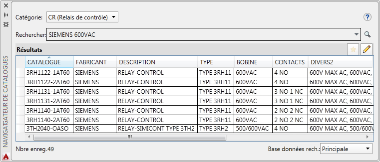 La prochaine fois que le Navigateur de catalogues utilise la table _LISTBOX_DEF pour une bobine de relais, la boîte de dialogue s'ouvre avec la recherche prédéfinie et effectuée.