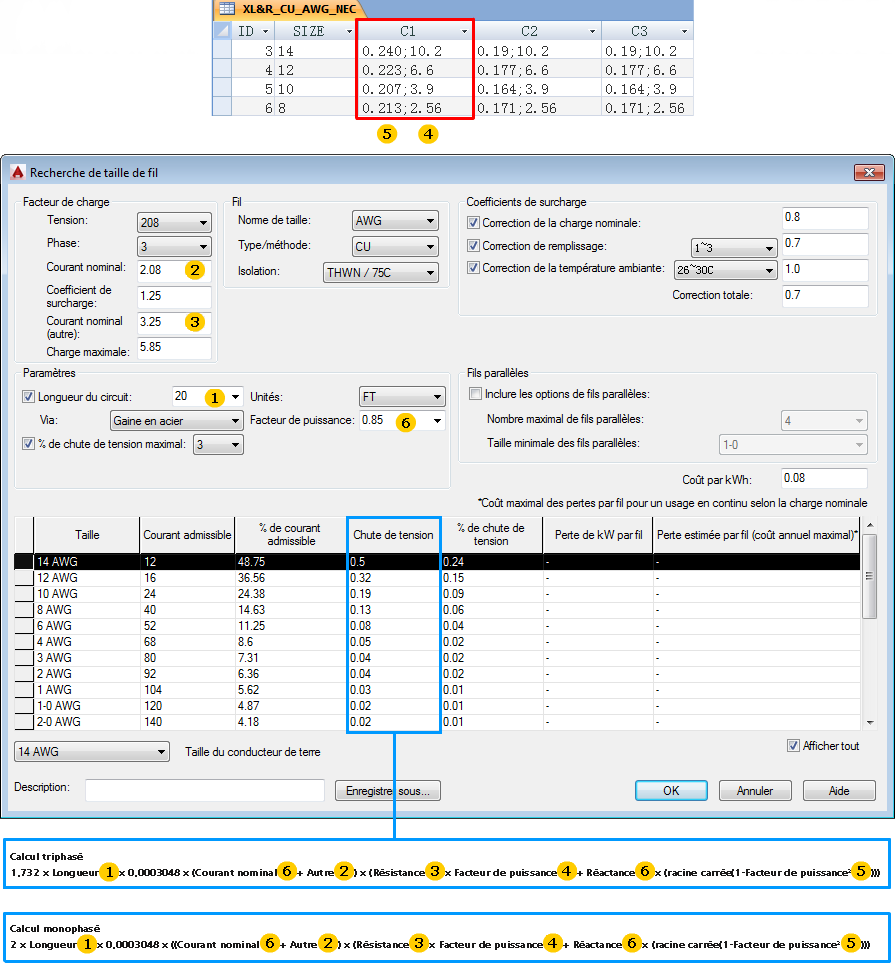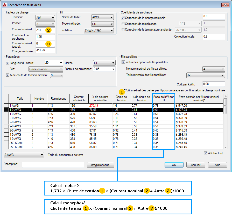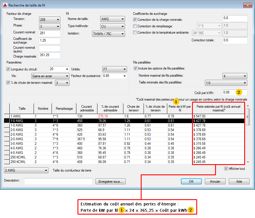 Spécifiez les paramètres de fil et sélectionnez une taille de fil dans la liste des tailles de fil respectant ou dépassant ces paramètres. Les pertes d'énergie estimées par taille de fil permettent de disposer d'informations utiles sur cette sélection.