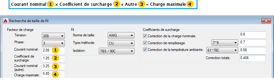 Affiche la charge maximale calculée pour les conducteurs. Elle est basée sur la valeur du courant nominal (autre) ajoutée au produit du courant nominal et du coefficient de surcharge. |