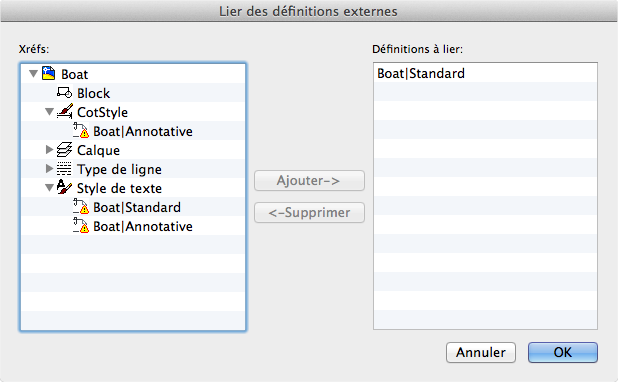 Déplace les définitions d'objet nommé sélectionnées dans la liste des xréfs vers la liste Définitions à lier.