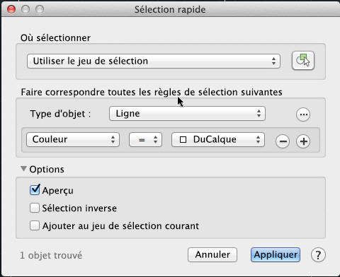 Applique les critères de filtrage à l'ensemble du dessin ou au jeu de sélection courant (s'il en existe un).