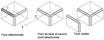 Vous pouvez dupliquer la face d'un objet solide 3D en utilisant l'option de copie de la commande EDITSOLIDE. Les faces sélectionnées sont copiées en tant que régions ou corps.
