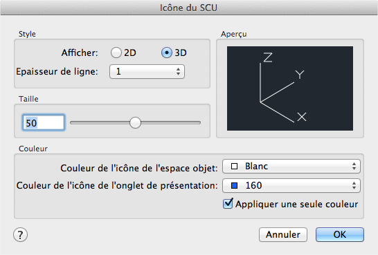 Spécifie l'affichage de l'icône SCU en 2D ou 3D, ainsi que son aspect.