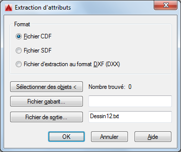 Spécifie le format de fichier des informations d'attribut, les objets à partir desquels vous voulez extraire des informations, ainsi que les noms du gabarit et du fichier de sortie.