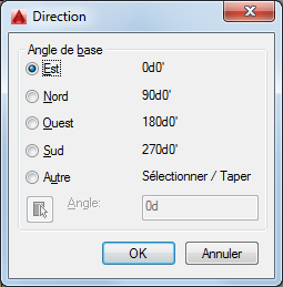 Définit la direction de l'angle zéro. Les options suivantes affectent l'entrée des angles et l'entrée des coordonnées polaires, cylindriques et sphériques.
