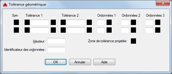 Affiche le symbole géométrique caractéristique sélectionné dans la boîte de dialogue Symbole. Celle-ci s'affiche pour vous permettre de sélectionner l'une des boîtes de texte Sym.