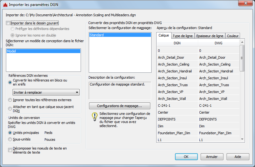 Sélectionne et gère la configuration de mappage utilisée dans l'importation DGN courante.