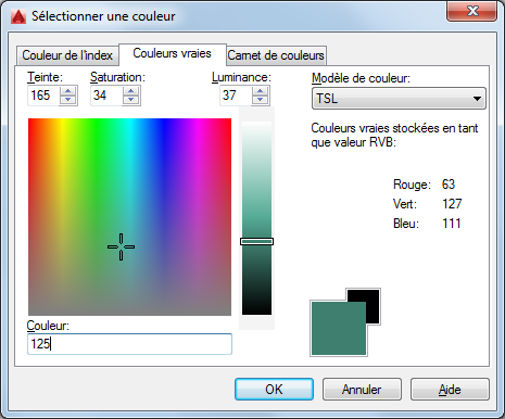 Spécifie le modèle de couleurs RVB pour la sélection des couleurs. Les options disponibles dans l'onglet Couleurs vraies dépendent du modèle de couleurs indiqué : TSL ou RVB.