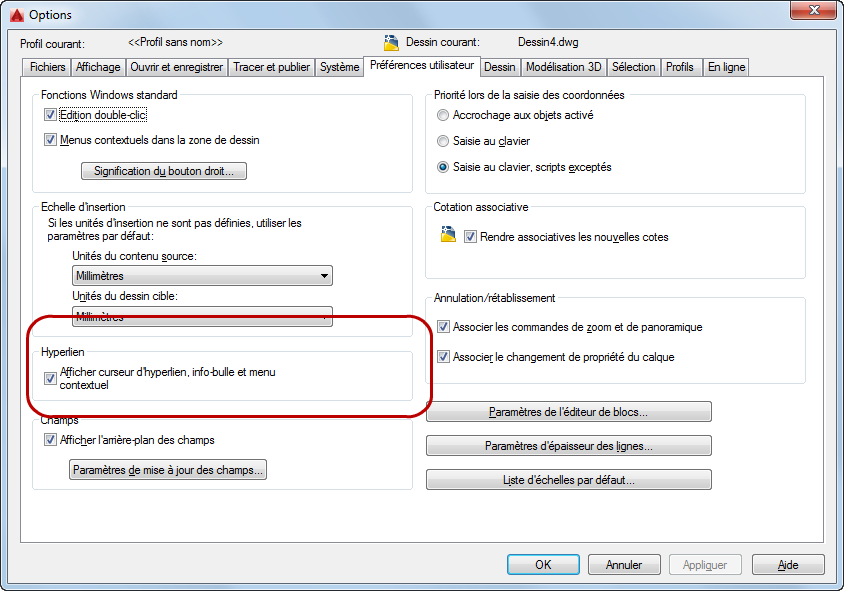 Activez l'affichage des informations sur l'hyperlien à partir de l'onglet Préférences utilisateur de la boîte de dialogue Options.